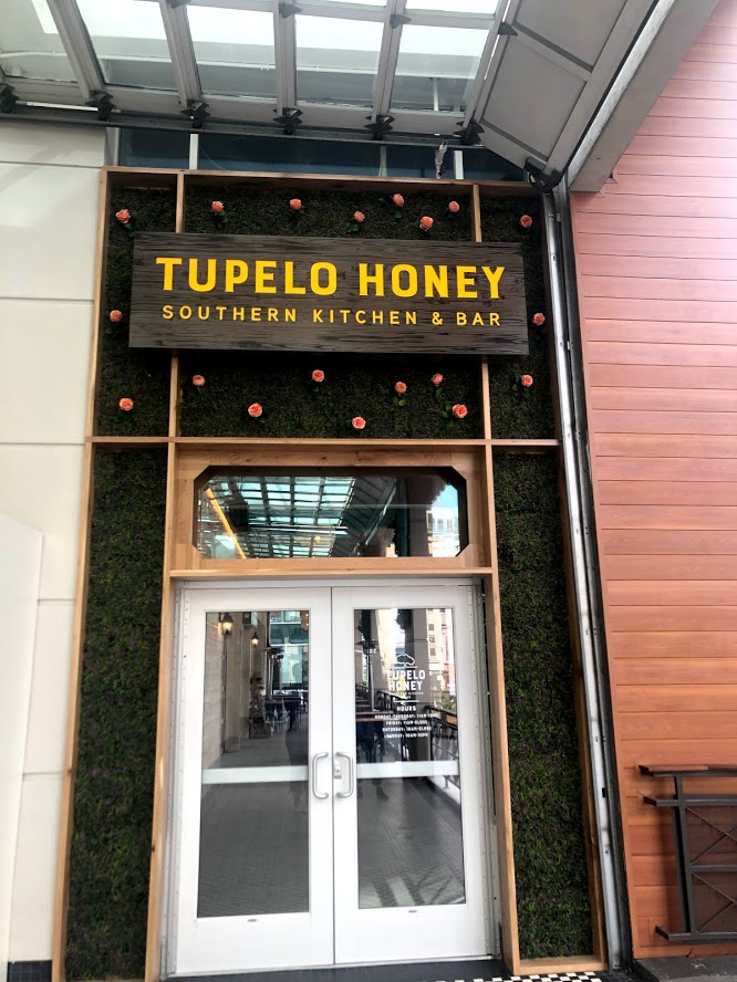 Now let’s talk food. Visitors can expect to see Southern-inspired menus with lunch, brunch and dinner options. We got the chance to sample multiple different Tupelo Honey longtime favorites including the delicious Cathead Biscuits, famous fried green tomatoes, honey shrimp and grits, honey dusted fried chicken and banana pudding.